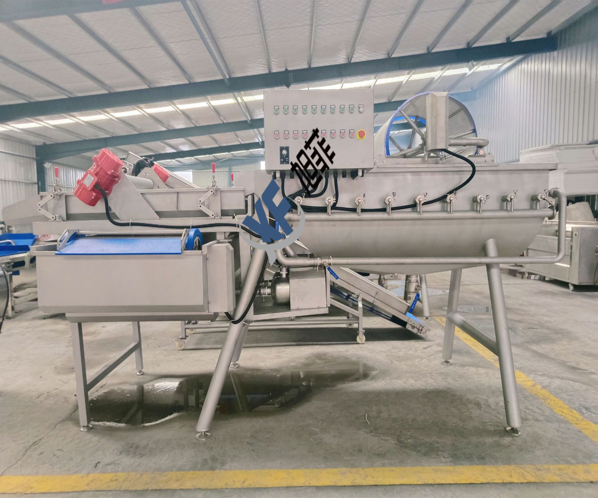 2.采用悬挂式双排喷淋系统会形成高密度喷淋带,菜品物料由槽体内水流循环清洗后输送至振动筛。